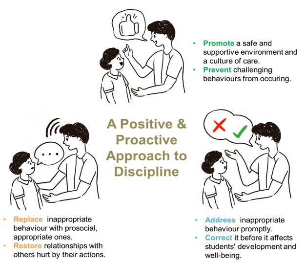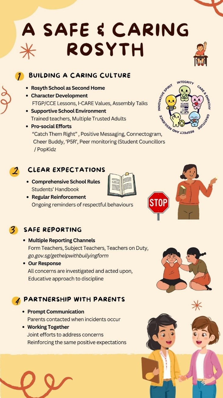 In Rosyth, we want to foster a safe and orderly environment through an educative disciplinary process that empowers students to take responsibility for their actions and grow into respectful, future-ready individuals. In this process, we guide students to understand the impact of their choices and develop better decision-making skills. We work collaboratively with students and parents to address the root causes and build the skills needed for positive behaviour. Our focus is on teaching the school’s ICARE values through meaningful learning experiences.