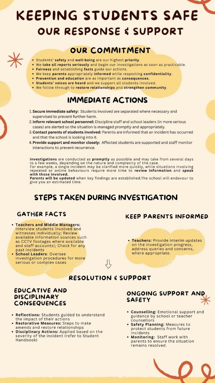 Creating a safe and supportive learning environment is fundamental to our students’ well-being. Our comprehensive approach to addressing hurtful behaviours and bullying centres on building a strong culture of care across the school community, supported by proactive upstream efforts, timely and responsive interventions and sustained follow-through to support every child.